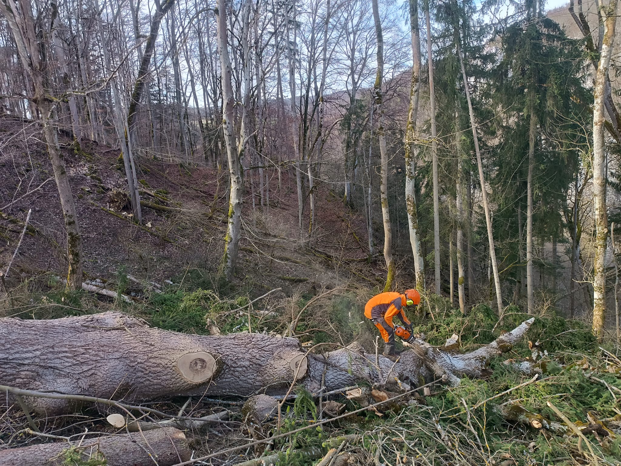 Der Fallbereich muss genau untersucht werden, um unnötige Risiken auszuschließen. Darauf aufbauend werden wir dann den Ablauf und die Fälltechnik festlegen. Die Arbeit mit Keilen, Stützleisten, Winden und Seilen oder schweren Geräten ist eine unserer Kernaufgaben.